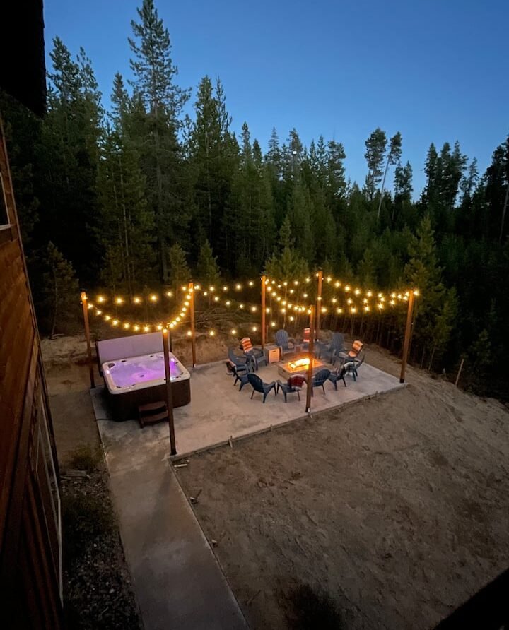 đ Large 7-person hot tub and firepit area that seats 12 with blankets and string lights for your enjoyment at night.