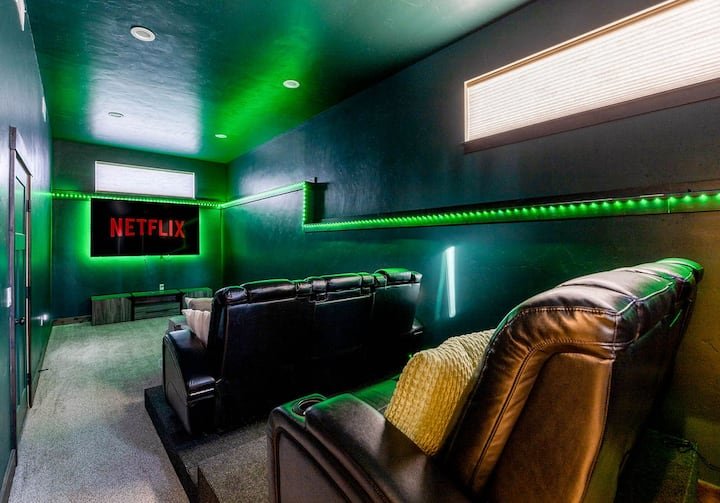For a cinematic experience, head to the theater room where you can relax and watch your favorite movies or shows on a large screen. Enjoy the powered recliner chairs with cup holders and popcorn tubs.